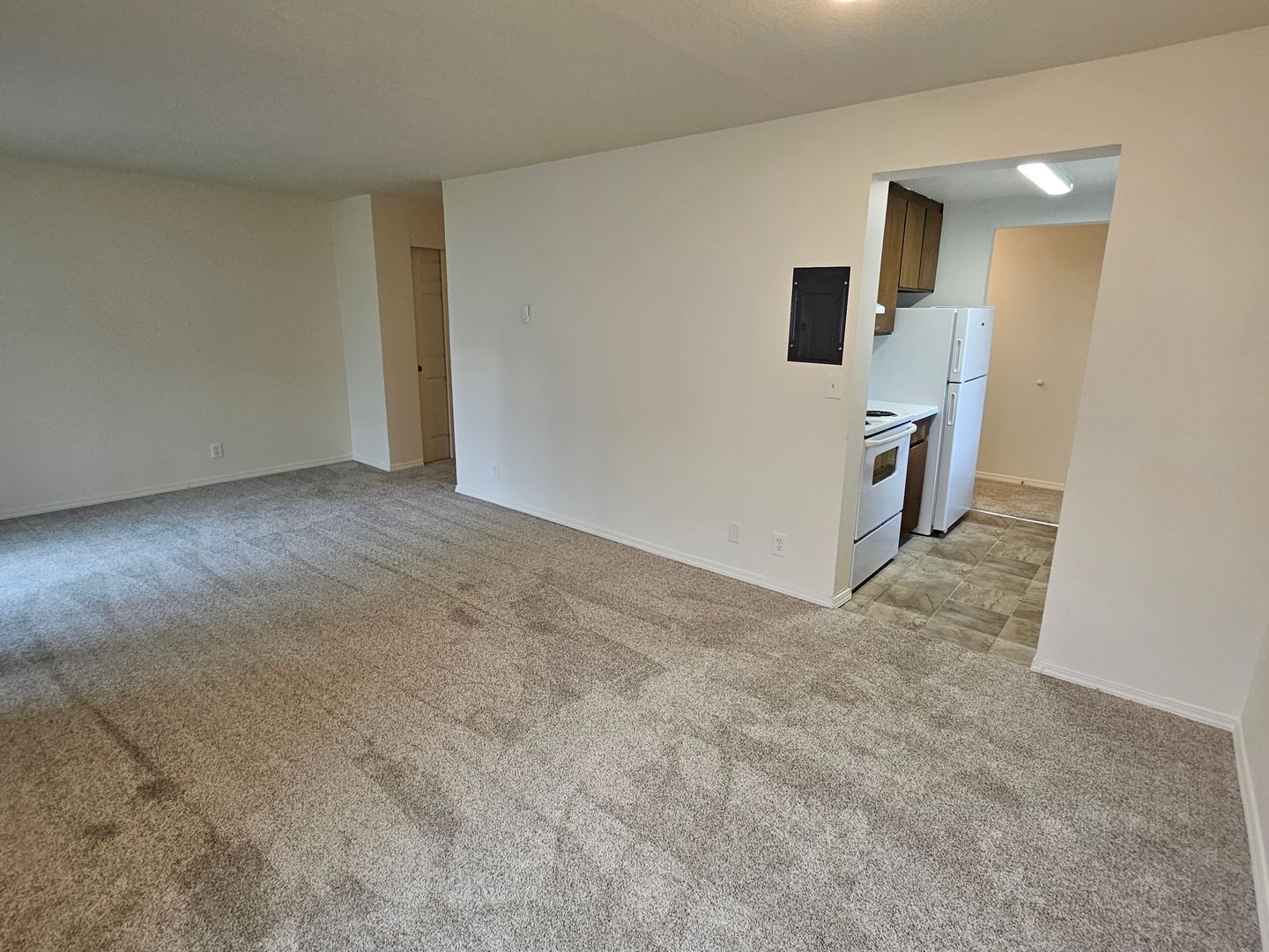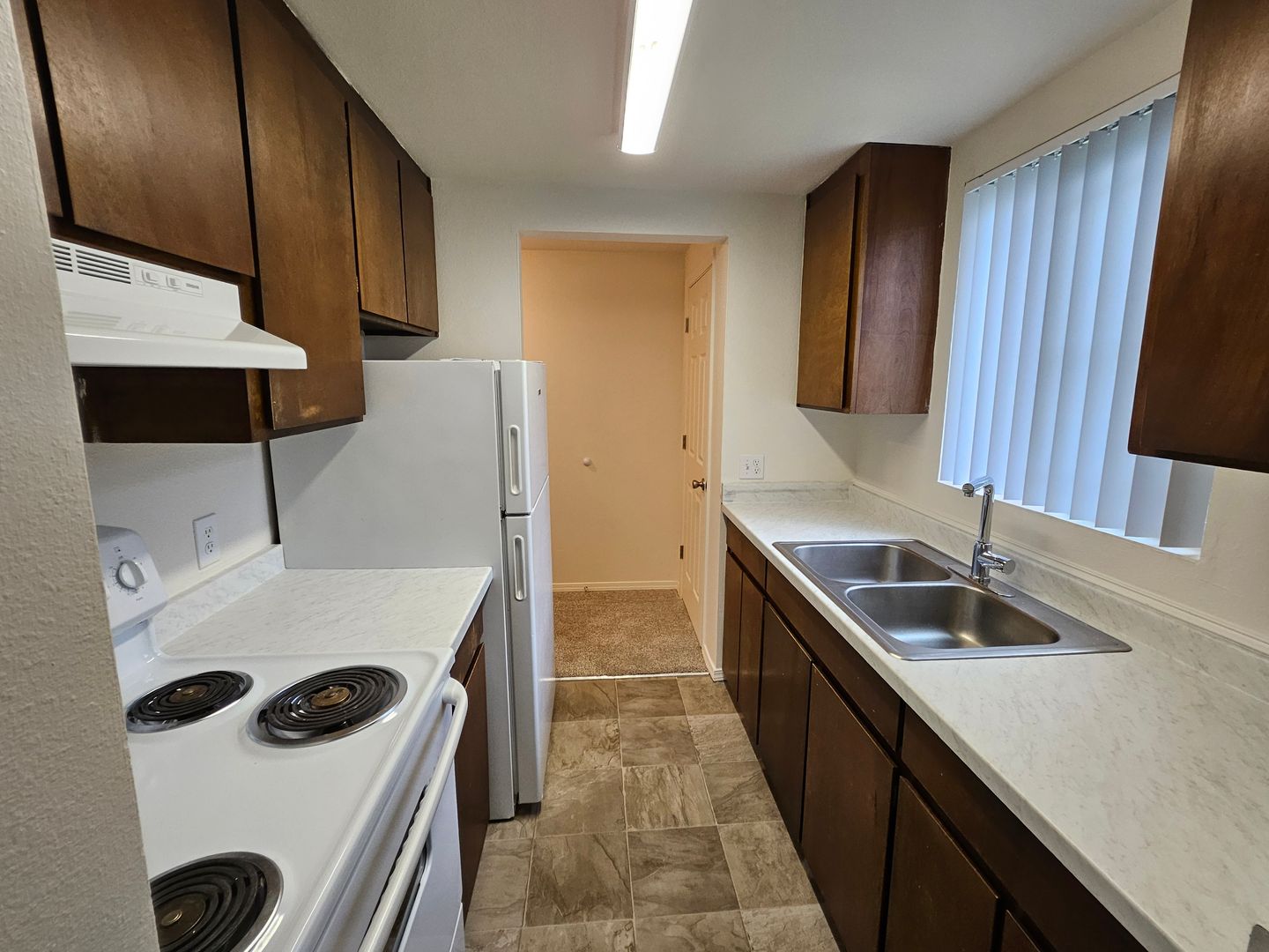 Upstairs 2-bedroom, 1-bathroom unit with fresh paint throughout. Kitchen includes refrigerator, range & nice sized pantry. Also property provides each unit with a portable AC Unit to help keep things cool. Property features onsite laundry, a playground, and convenient access to public transportation with a bus line nearby.